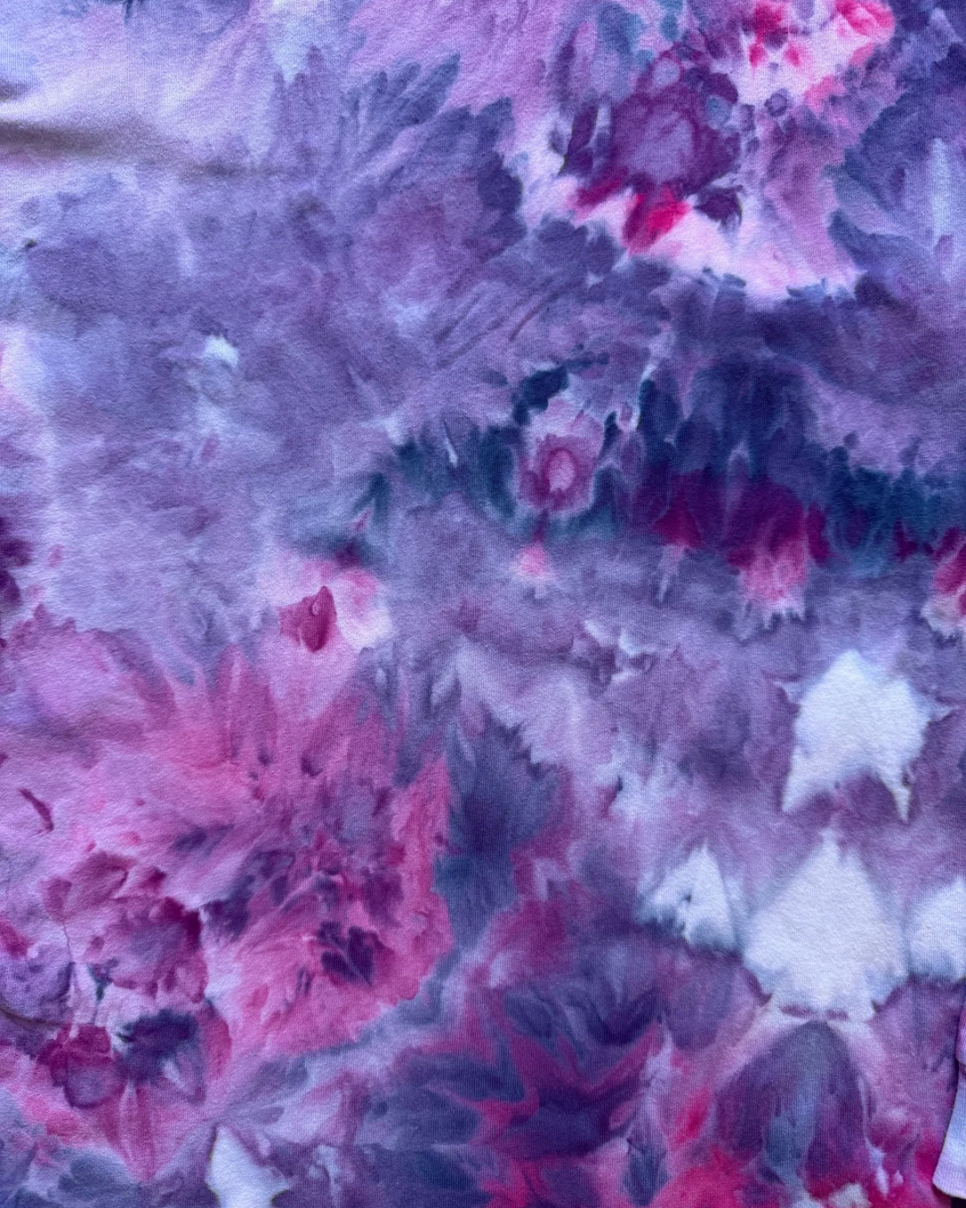 This 100% cotton long sleeve t-shirt is a unisex adult large and ice dyed in pinks, purples, and a touch of blue.