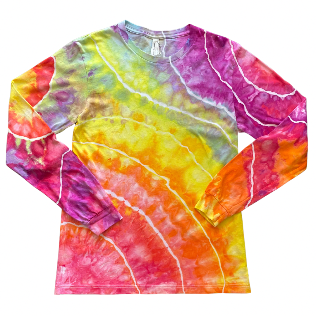 This rainbow ice dyed 100% cotton long sleeve t-shirt is a unisex adult medium.