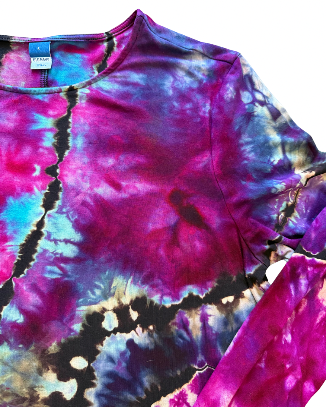 Please note: this garment is upcycled. It has been previously worn and has been ice dyed to give it a new life with color.