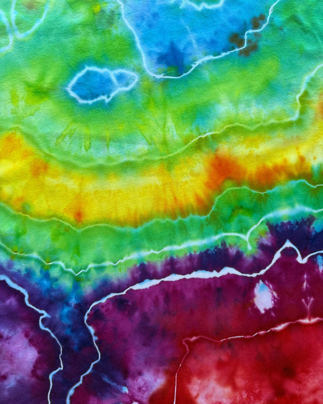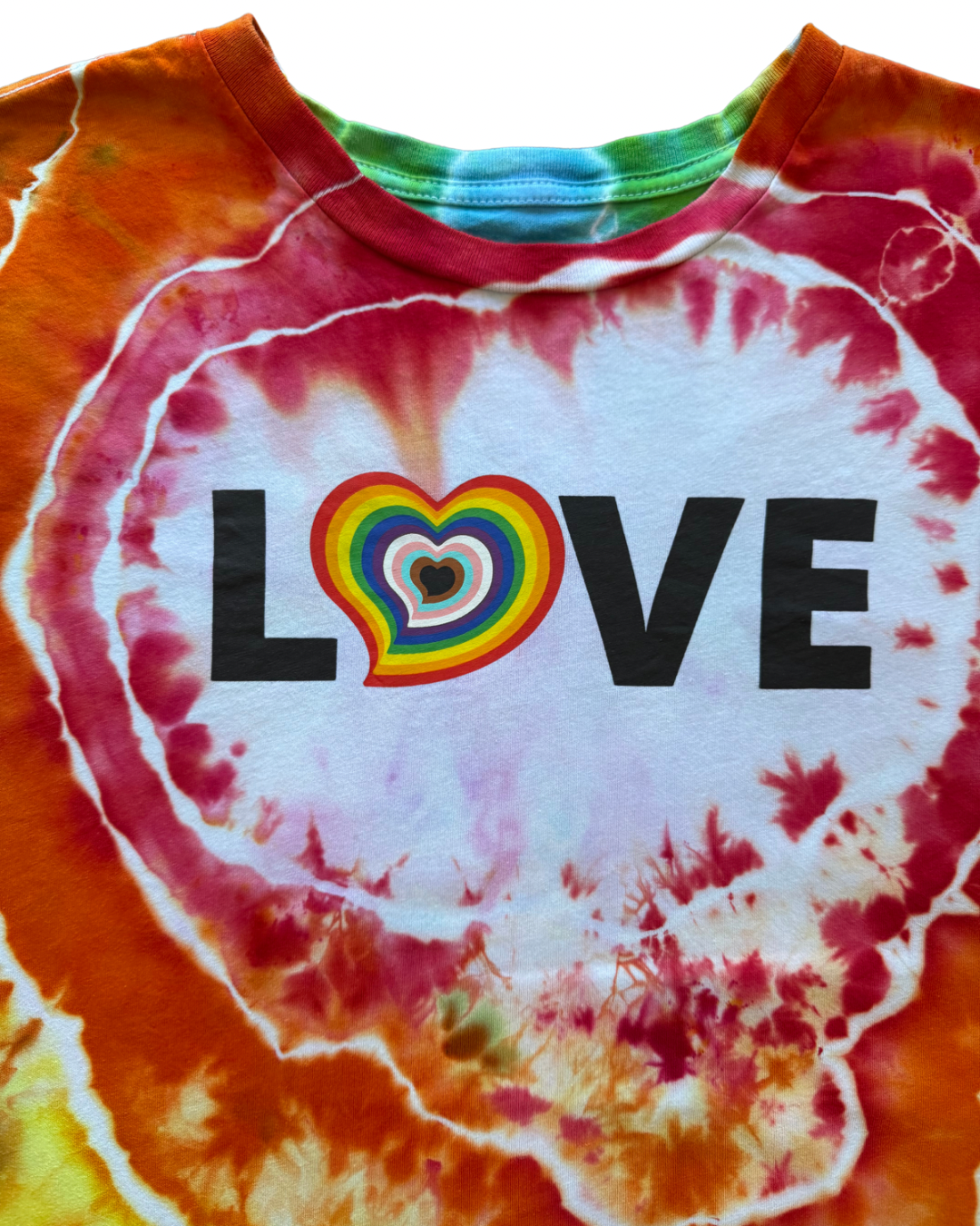 This Phluid Project unisex XL t-shirt has been upcycled by adding color with ice dye. It features the word “Love” with a heart graphic. Made with 100% cotton, this shirt is one-of-a-kind.