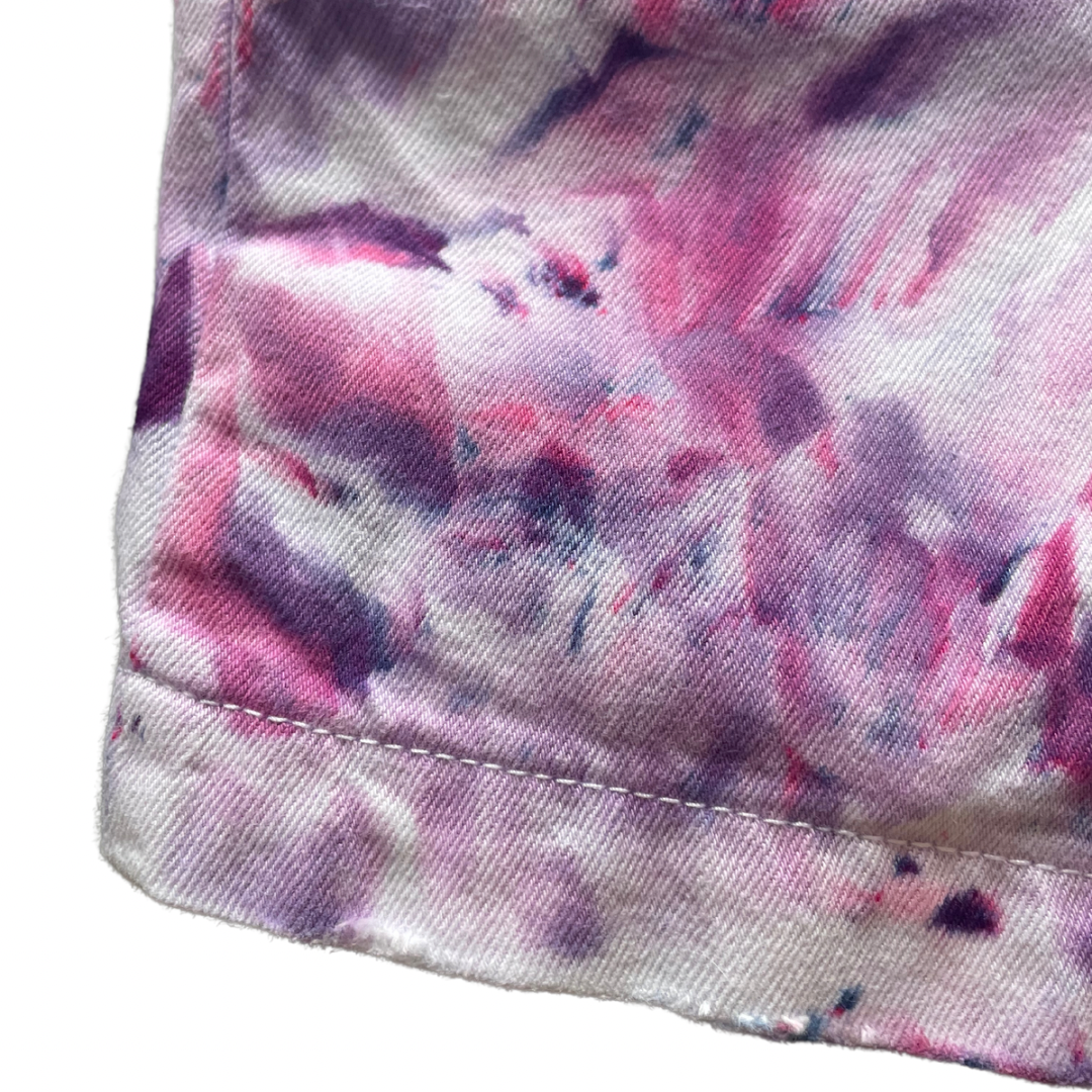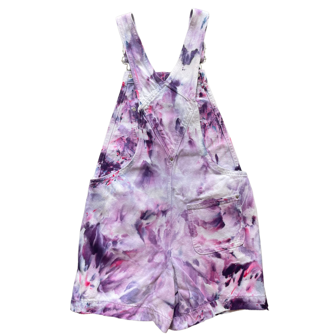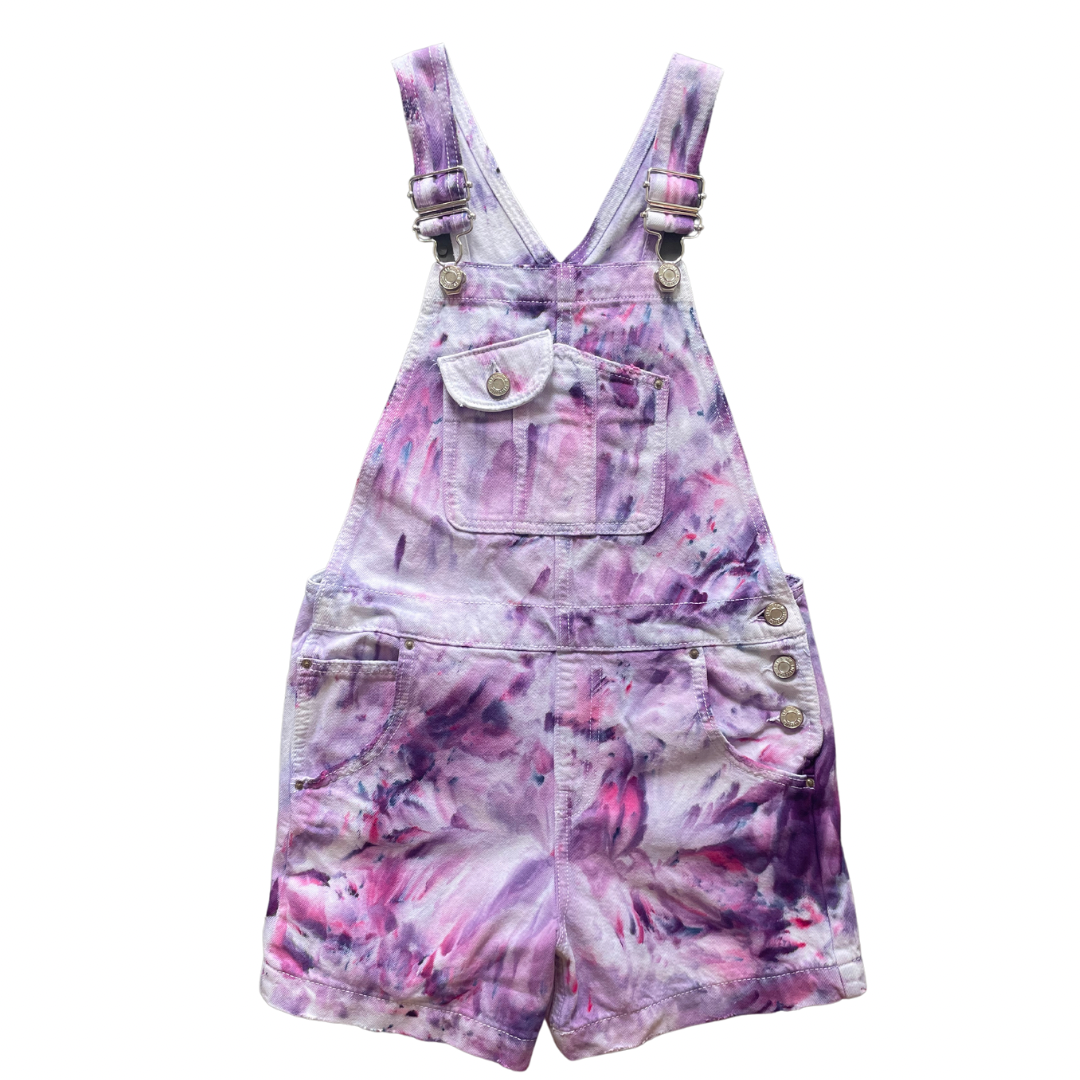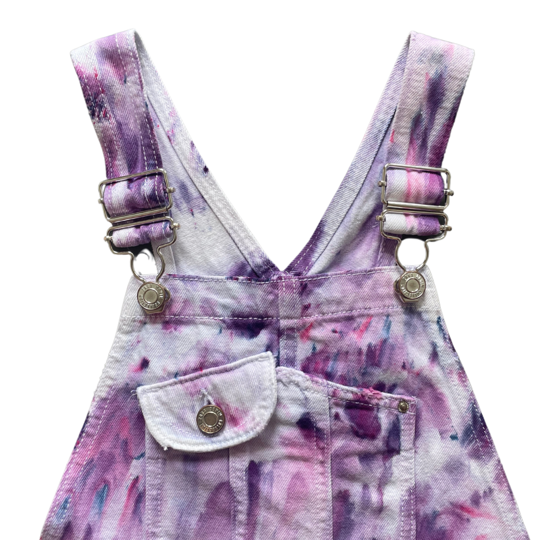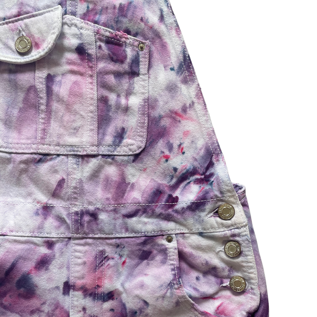 These Zara girls' distressed denim overall shorts are size 11-12 years and have been upcycled by adding color with ice dye. Made with 100% cotton, these overall shorts have adjustable buckle straps, one side with three button closures, and patch pockets at the chest and back.