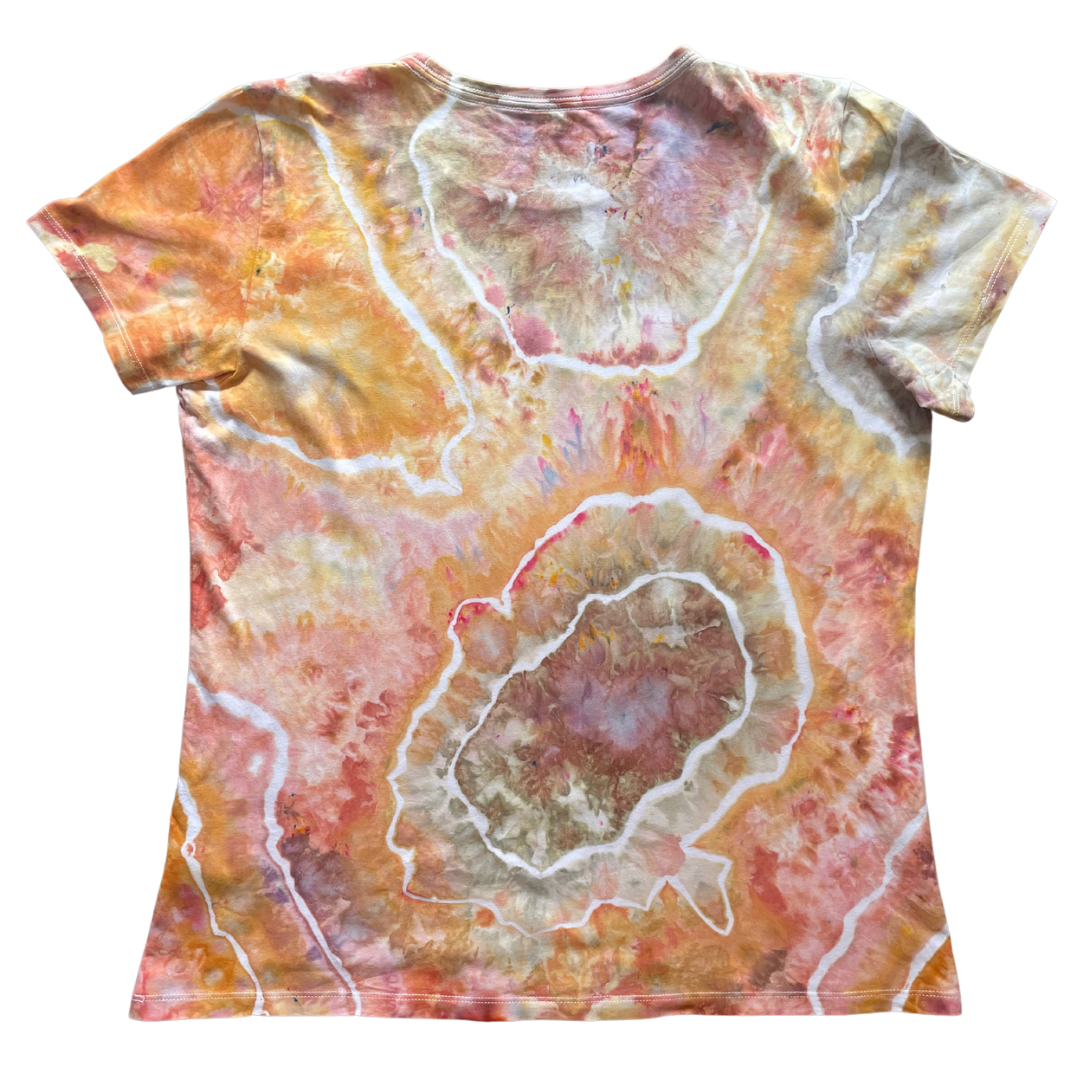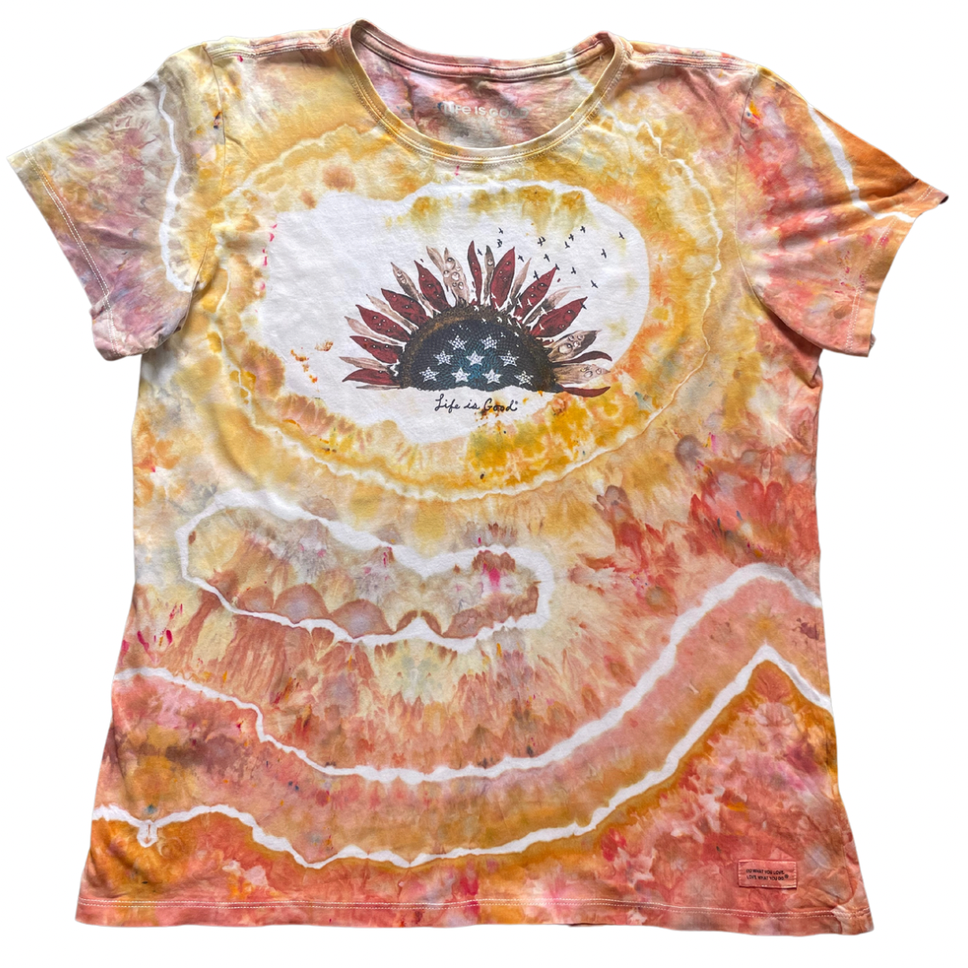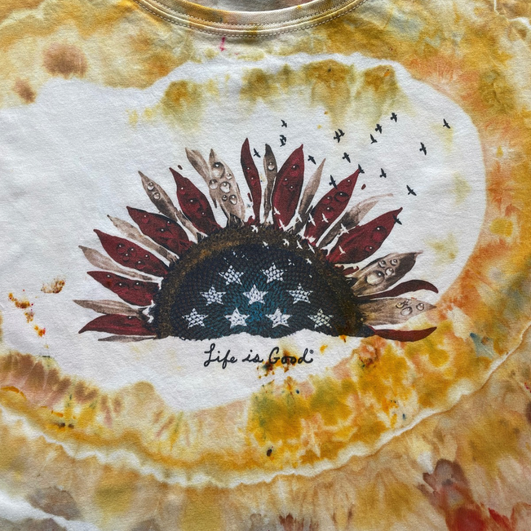 This Life is Good woman's large t-shirt has been upcycled by adding color with ice dye. It features a sunflower with stars and small birds design. Made with 100% cotton, this shirt is one-of-a-kind.
