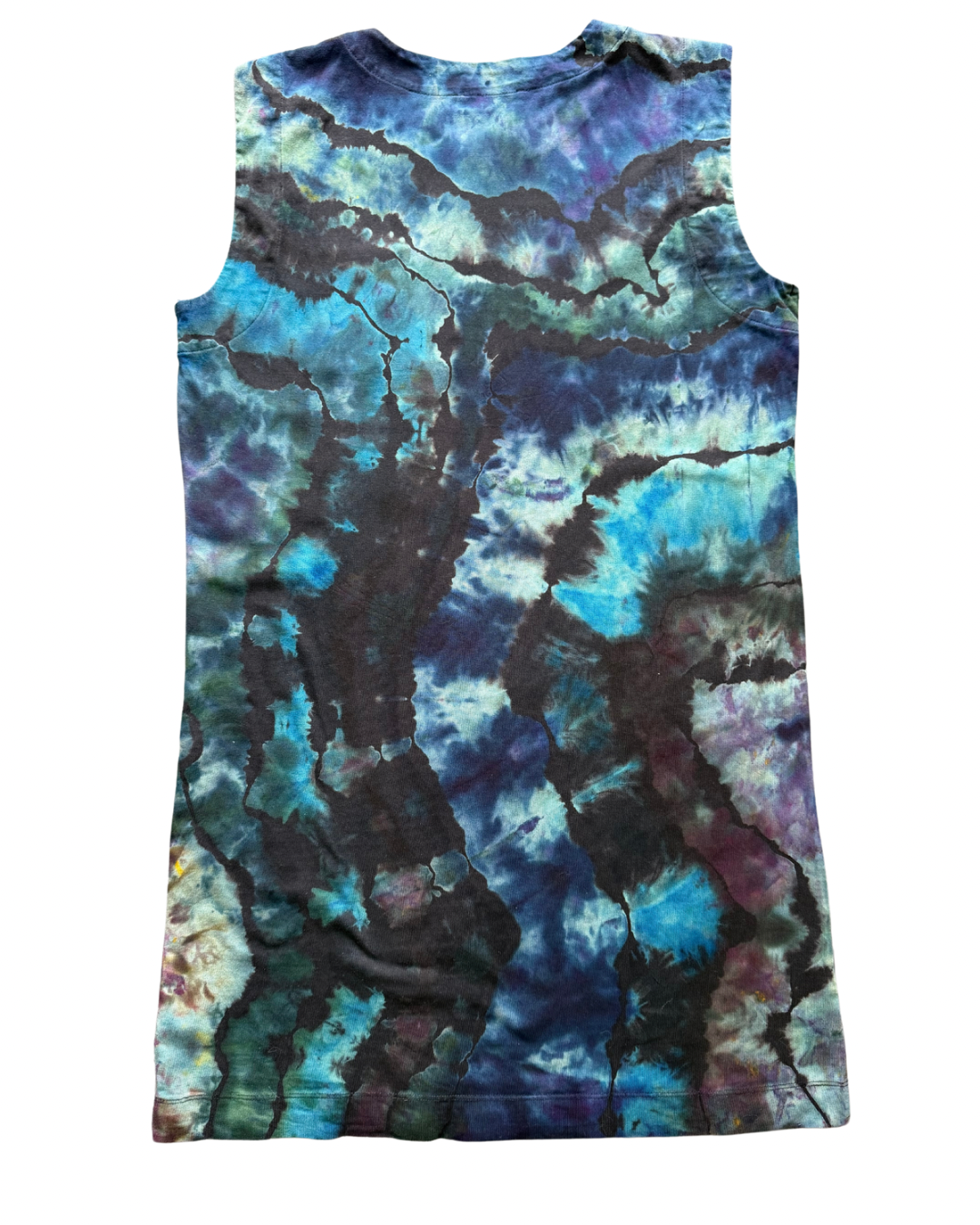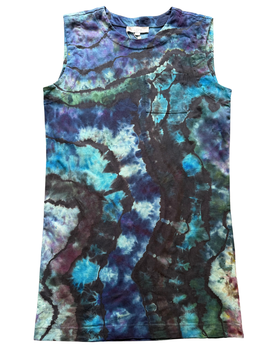 Made by Loft, this medium tall sleeveless dress was originally black and has been ice dyed to create a unique look. It has one small pocket at the chest and is made of 100% cotton.