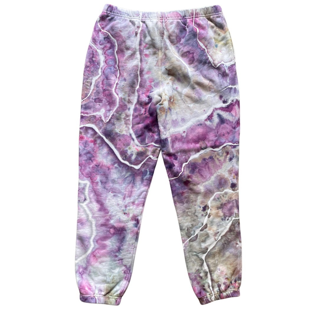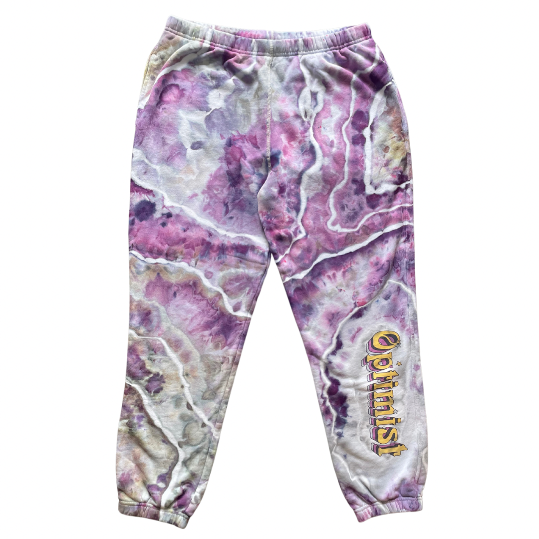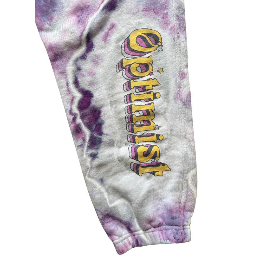Originally new with tags, these Spiritual Gangster large joggers feature the word "Optimist" on the leg. Upcycled with ice dye, these joggers have a functional drawstring, side seam pockets and elastic cuffed legs. Made with 100% cotton, these joggers are truly one-of-a-kind!